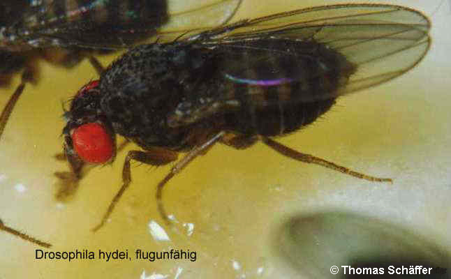 auch 2 flugunfähige Zuchtformen der Fruchtfliege