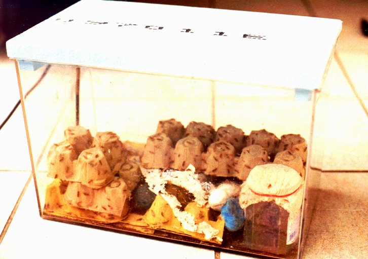 Als Zuchbehälter eignen sich alle glattwandigen Gefäße wie Kunststoffaquarien, Plastikeimer oder -wannen mit Deckel usw., an denen die Tiere nicht hochklettern können. Das Volumen sollte 5 Liter nicht unterschreiten. In den Behälter gibt man als Lauffläche, Versteckmöglichkeit und gleichzeitig als "Reservefutter" Eierwaben oder zerknülltes Papier. Da die Weibchen die Eier besonders gerne in Watte ablegen, gibt man 5 - 10 Wattebällchen als Ablagesubstrat hinein. Ein Marmeladenglas mit Wasser, dessen Öffnung mit einem Stofflappen oder Gaze verschlossen wird, vervollständigt die Einrichtung. Dieser Wasserbehälter dient nicht als Tränke sondern zur Erhöhung der Luftfeuchtigkeit, die Abdeckung verhindert ein Ertrinken der Ofenfischchen. In den Deckel des Zuchtbehälters bohrt man so viele Lüftungslöcher, bis sich an den Behälterwandungen kein Kondenswasser mehr bildet. Um die optimale Zuchttemperatur von 35-37°C zu erreichen, stellt man die Zucht an einen warmen Ort, z. B. in den Heizungskeller oder auf den Beleuchtungskasten des Terrariums. Sollte dieses nicht möglich sein, ist es unbedingt erforderlich ein Heizkabel oder eine Heizmatte (6 Watt reichen völlig aus) direkt in den Zuchbehälter zu legen. Bei Temperaturen unter 30°C gelingt die Zucht nicht! Als Nahrung nehmen Ofenfischchen alle stärke- und zuckerhaltigen, trocknen Stoffe wie Haferflocken, Bierhefe, Milchpulver und Fischfutter. Man kann ruhig im Überschuß füttern, so daß man sich wochenlang nicht um die Zucht kümmern muß! Zur Entnahme der Futtertiere klopft man die Ofenfischchen über einem