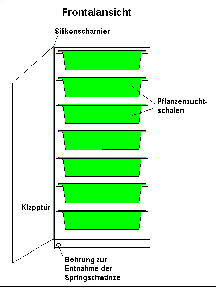 Im Bau- oder Pflanzenmarkt erhältliche Pflanzenzuchtschalen mit den Maßen 22 x 17 x 5 cm (L x B x H) wurden als Zuchtbehälter ausgewählt. Hierfür klebte ich nach Maß einen Glasschrank, in den sich die Behälter schubfachartig übereinander einschieben lassen. Der Behälter hat die Abmessungen 24 x 30 x 51 cm (L x B x H). Die Frontseite ist geteilt, der obere Teil mit 48,5 cm Höhe ist als Klappe mit seitlichem Silikonscharnier eingeklebt und läßt sich so sehr dicht verschließen. Der untere Teil der Frontseite besteht aus einem 2,5 cm hohen, fest eingeklebten Glassteg. Die Deckscheibe hat nach hinten ca. 2 cm Gefälle, damit das Kondenswasser zur Rückseite hin abläuft. Die Pflanzenzuchtschalen werden auf 15 mm breiten Glasstreifen, die an die beiden Seitenscheiben geklebt wurden, in den Schrank eingeschoben. Die untere Schale hängt auch auf Schienen, so daß zum Boden des Zuchtschrankes noch ca. 3 cm Abstand sind. Die Bodenplatte des Glasschrankes ist schräg eingeklebt, so daß sich ein Gefälle nach links vorne ergibt. An dieser tiefsten Stelle befindet sich im Glassteg der Frontseite eine 10 mm Bohrung zur Entnahme der Futtertiere, die mit einem Gummistopfen verschlossen ist. Die 7 Zuchtschalen wurden ca. 3 cm hoch mit lockerem Humus aus einem Buchenwald gefüllt und so viel Wasser aufgesprüht, daß sich ein Wasserstand von ca. 1 mm einstellte. Jeder Schale wurde mit einem Zuchtansatz von Springschwänzen versehen und so in den Glasschrank eingeschoben, daß die Hinterkante die Rückscheibe des Schrankes berührt. Dieses hat den Sinn, daß die Springschwänze nur an der Vorderkante, die einige Zentimeter Abstand zur Glastür hat, aus den Schalen entweichen können. Der Zuchtschrank wurde in meinen Terrarienzimmer aufgestellt, in dem die Temperatur zwischen 18 und 25 Grad Celsius liegt. Es stellte sich im Zuchtschrank eine Luftfeuchtigkeit von 90 - 100 % ein. Nun hieß es nur noch warten. In den ersten Wochen habe ich die wenigen Springschwänze, die sich durch entweichen aus den Schalen am Behälterboden sammelten, nicht verfüttert. Ich spülte sie jede Woche einmal mit Wasser aus der Entnahmebohrung in ein Gefäß und gab sie wieder in die Zuchtschalen zurück. Erst nach ca. 3 Monaten begann ich damit die Menge von etwa einem halben Teelöffel wöchentlich zu entnehmen. Die Anzahl der sich am Behälterboden sammelnden Tiere stieg stetig, so daß ich, seit die Kultur ein halbes Jahr in Betrieb ist, etwa alle 2-3 Tage die Ausbeute von einem Teelöffel zum Verfüttern habe. Die Zucht läuft nun so bereits über 1 ˝ Jahre bei mir. Es hat sich scheinbar ein Gleichgewicht zwischen Entweichen der Springschwänze aus den Zuchtschalen und deren Vermehrung eingestellt. Obwohl beim ersten Hinschauen kaum Tiere in den Zuchtschalen zu sehen sind, da sie zum größten Teil im Humus verschwunden sind, ist die Individuenzahl wesentlich höher, als sie bei meinen bisherigen Zuchten mit den plattenförmigen Substraten gewesen ist. Dieses habe ich überprüft, indem ich einmal eine Zuchtschale mit Wasser geflutet habe. Erstaunlich, wieviel Tiere da an der Oberfläche auftauchten! Der Hauptvorteil dieser Zuchtmethode ist aber, daß sie fast ohne jede Pflege auskommt. Lediglich alle 2-3 Wochen muß mit etwas pulverisiertem Fischfutter nachgefüttert werden. Dazu wird das Futter aufgestreut und dann mit einer Gabel dem Substrat untergemengt. Zusätzlich wird nach Bedarf frischer Humus hinzugefügt, da dieser in den Zuchtschalen nach und nach zusammenfällt. Als "Langzeitfutter" benutze ich das Laub von leicht verrottenden Baumarten wie Kastanie, Kirsche, Nußbaum etc. Das Laub wird im Herbst aufgesammelt, getrocknet und nach Bedarf zerbröselt und in die Zuchtschalen gegeben. Von den Blättern ist nach einigen Wochen nur noch das Blattgerippe übrig, ein Zeichen, daß es den Springschwänzen geschmeckt hat. Nach etwa einem Jahr sind Laub und Humus soweit abgebaut, daß es sich zu einer pampigen Masse verdichtet. Dann muß der Inhalt der ganzen Schale, nach Abtrennung der Springschwänze, entfernt und durch frisches Substrat ersetzt werden. Dieser Pflegeaufwand steht in keinem Verhältnis mehr zu dem, den ich früher hatte, als ich noch 20 bis 30 einzelne Plastikschalen mit Deckel alle 2 Tage zu versorgen hatte. Die Gesamtausbeute ist in etwa so wie ich sie sonst mit rund 20 Zuchtbehältern der Größe 11 x 11 x 5 cm erzielt habe. Um größere Futtertiermengen zur Verfügung zu haben, müßte man Zuchtschrank und -schalen größer dimensionieren.Zusammenfassend ist zu sagen, daß sich die beschriebene Methode zur Zucht von Springschwänzen bei mir hervorragend bewährt hat. Sie hat sich als extrem pflegearm und stabil herausgestellt. Auch Milbenbefall und Schimmelwachstum sind bisher, wahrscheinlich durch die hohe Populationsdichte der Springschwänze, noch nicht vorgekommen. Lediglich die lange Einfahrzeit von mindestens 3 Monaten, die man aber unbedingt einhalten muß, stellt eine Gedultsprobe für jeden Futtertierzüchter dar. Ich hoffe, daß dieser Artikel den einen oder anderen Springschwanzzüchter dazu anregt, zu Glasschneider und Silikonspritze zu greifen und sich selbst mal einen "Minikomposthaufen fürs Wohnzimmer" zu kleben. Es wird ihm auf Dauer einige Arbeit ersparen! Literatur: Wyniger, R. (1974): Insektenzucht. -Ulmer, Stuttgart Friederich, U. & W. Volland (1992): Futtertierzucht. -Ulmer, Stuttgart Nachtrag 1: Um einen neuen Zuchtschrank zu starten, kann man auch ein großes luftdicht zu verschließendes Gefäß mit Humus füllen und einige Springschwänze als Startpopulation zugeben. Dann läßt man das Gefäß einfach einige Monate stehen und füllt das dann das voller Springschwänze sitzende Substrat in die Zuchtschalen im Schrank. Dadurch entfällt das lästige Ausspülen und oben Wiedereinbringen der Springschwänze beim Einfahren eines Zuchtschrankes! Nachtrag 2: In einigen Versuchen habe ich festgestellt, dass sich Pilze (ja richtig, Champions und Co.) sehr gut als Spri